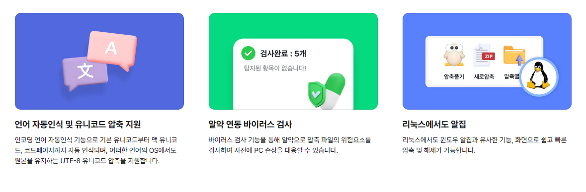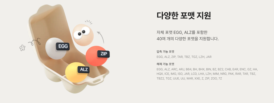 - 다양한 포맷 지원: ZIP, RAR, 7Z, ALZ 등
