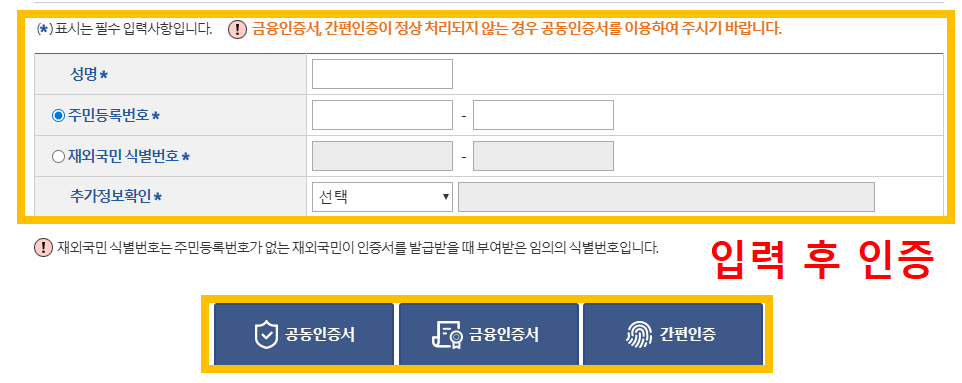 - 인증서 또는 간편인증(공동·금융·PASS 인증 등)으로 로그인 및 본인확인.